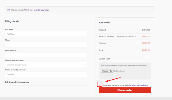 Jangan lupa, Tick bahagian 'Term and Condition' seperti anak panah diatas. Kemudian barulah anda Place Order